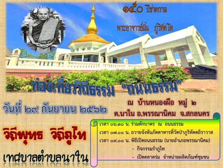 เทศบาลตำบลนาใน อ.พรรณานิคม จ.สกลนคร ขอเชิญท่องเที่ยวเชิงธรรมะ วิถีพุทธ วิถีภูไท ณ บ้านหนองผือ ต.นาใน (บ้านที่ตั้งวัดป่าภูริทัตตถิราวาส) วัดอาจารย์มั่น ภูริทตฺโต ในวันที่ 29 กันยายน 2562