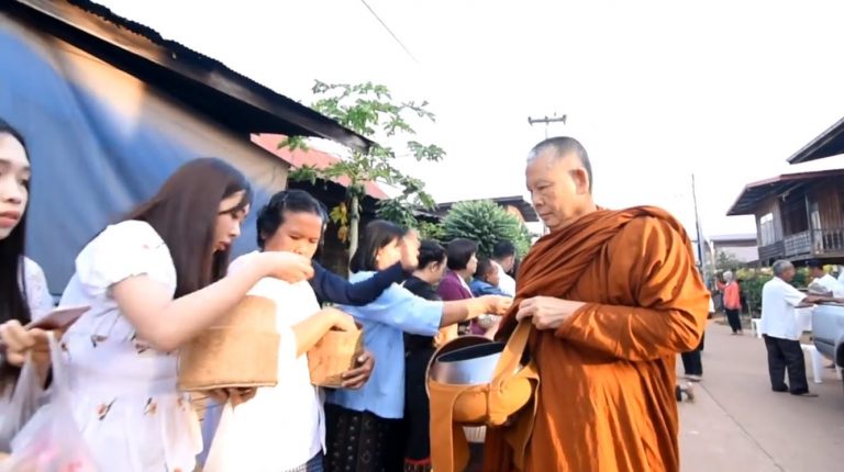 พระครูสุทธธรรมาภรณ์ หลวงพ่อพยุง ชวนปญฺโญ นำพระภิกษุออกรับบิณฑบาต งานน้อมรำลึกวันคล้ายวันมรณภาพปีที่ ๗๐ ท่านพระอาจารย์มั่น ภูริทัตตเถระ เช้าวันอาทิตย์ที่ ๑๐ พฤศจิกายน ๒๕๖๒ ณ ถนนธรรมบริเวณกลางหมู่บ้านหนองผือ ตำบลนาใน อำเภอพรรณานิคม จังหวัดสกลนคร
