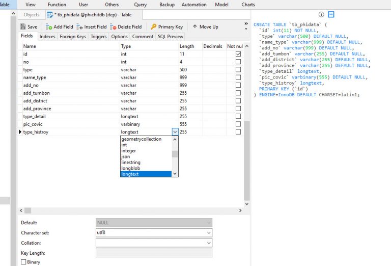 VARCHAR : สำหรับเก็บข้อมูลประเภทตัวอักษร ทุกครั้งที่เลือกชนิดของฟิลด์เป็นประเภทนี้ จะต้องมี การกำหนดความยาวของข้อมูลลงไปด้วย ซึ่งสามารถกำหนดค่าได้ตั้งแต่ 1 - 255 ฟิลด์ชนิดนี้ เหมาะ